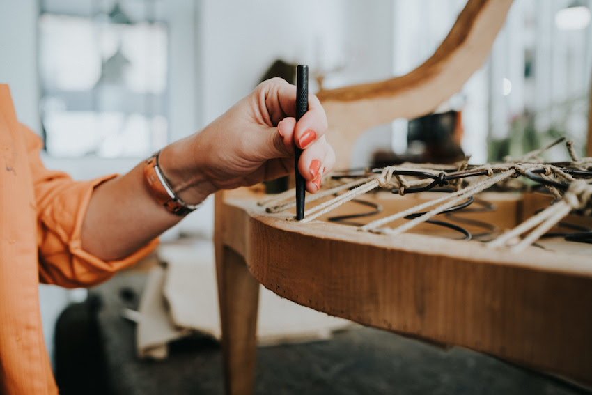 Travail sur une partie du siège, assise ou dossier et pose d’un nouveau tissu.